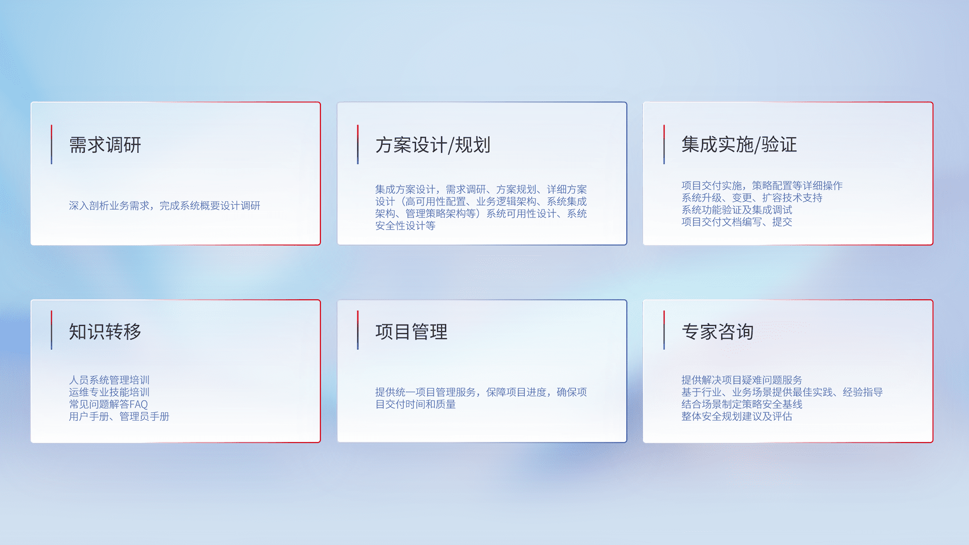 针对客户行业特性,,,将宏观的安全战略和需求,,,通过专业的交付服务,,,实现项目落地,,,为客户提供标准规范的集成交付服务。。。